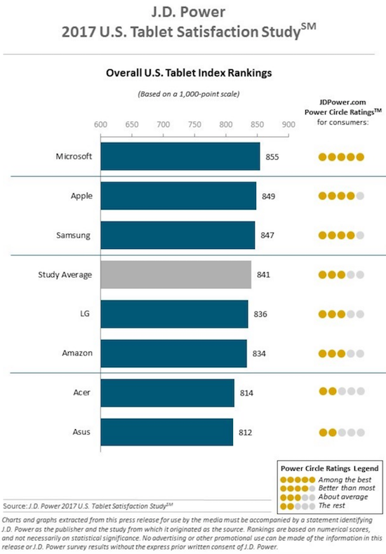 Der Sieg von Microsoft ist laut J.D. Power vor allem auf die hohen Bewertungen bei den Features und im Bereich Gerätedesign zurückzuführen. Auch die vorinstallierten Apps, die Internetverbindung und die Verfügbarkeit von direkt von Microsoft stammenden Zubehör wurde lobend hervorgehoben.