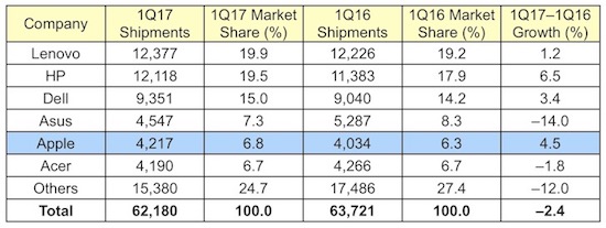 Während der weltweite PC-Markt weiter auf dem Rückgang ist, konnte Apple auch im ersten Quartal mit dem Mac einen kleinen Anstieg verzeichnen, wie aktuelle Zahlen von Gartner zeigen. Demnach konnte Apple in den ersten drei Monaten des Jahres 2017 weltweit ungefähr 4.2 Millionen Macs absetzen, was einem leichten Anstieg von 4 Millionen im Vorjahresquartal bedeutet. Damit konnte Apple auch seinen Marktanteil um einen halben Prozentpunkt auf 6,8% steigern und hält seinen fünften Platz unter den Computerherstellern. Dort führt weiterhin Lenovo mit 20% Martkanteil vor HP mit 19,5% und Dell mit 15%. Während der Gesamtmarkt um 2,4% nachgab, konnte Apple mit dem Mac um 4,5% zulegen.