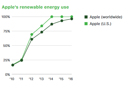 Während dabei sicherlich noch eine Menge Arbeit vor Apple liegt, können sich die in dem als PDF verfügbaren Bericht aber auch schon jede Menge Erfolge sehen lassen. Vor allem im Bereich der Nutzung erneuerbarer Energien konnte sich Apple in den vergangenen Jahren stetig verbessern und plant dies auch in Zukunft zu tun. Auch bei den Zulieferern drängt man inzwischen verstärkt auf die Nutzung regenerativer Energien. Sämtliche Serverfarmen Apples werden inzwischen aus erneuerbaren Energien gespeist. Und auch bei den restlichen weltweiten Gebäuden in Apples Besitz ist man auf dem besten Weg dorthin. Innerhalb von sechs Jahren konnte man so den Anteil der erneuerbaren Energien in den eigenen Gebäuden von 16% in 2010 auf 96% in 2016 steigern, wobei der neue Apple Park sicherlich das neue Aushängeschild sein wird.