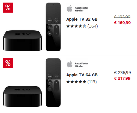 Nicht nur bei Lautsprechern, Kopfhörern und iTunes-Guthabenkarten lässt sich heute sparen, auch die aktuelle Generation des Apple TV und die zugehörige Siri Remote können derzeit zum vergünstigten Preis erworben werden. Dieses wird nämlich vom Versandhändler Otto zum kleinen Preis angeboten (mit Dank an Daniel!). Dabei erhält man das Modell mit 32 GB Speicherplatz aktuell zum Preis von € 169,99 statt der regulär dort veranschlagten € 193,93. Das 64 GB Modell kostet aktuell € 217,99 statt regulär € 236,99. Und wer einfach nur die Siri Remote Fernbedienung (beispielsweise als zweiten Gamecontroller) benötigt, erhält diese bei Otto derzeit zum absoluten Tiefstpreis von nur € 39,99 statt der normal geforderten € 79,99. Die folgenden Links führen direkt zu den Angebotsseiten auf Otto.de: