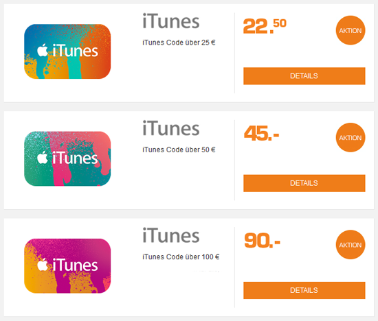 Darüber hinaus bietet Saturn derzeit auch die beliebten iTunes-Guthabenkarten vergünstigt an. So erhält man auf die Karten im Wert von € 25,-, € 50,- und € 100,- im Online-Kauhaus von Saturn aktuell einen Preisnachlass in Höhe von 10%. Der folgende Link führt direkt zu den vergünstigten Karten: iTunes Guthabenkarten bei Saturn