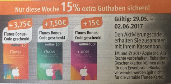 Achtung: Leider kann ich die Hinweise auf die günstigen iTunes-Karten nicht in jedem einzelnen Fall überprüfen. Checkt daher bitte vorher noch einmal ab, ob die jeweilige Filliale den Rabatt auch tatsächlich gewährt!