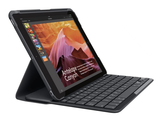 Die iPad-Schutzhüllen mit eingebauter Tastatur vom Zubehörhersteller Logitech erfreuen sich bereits seit Jahren großer Beliebtheit. Nun ist mit der Slim Folio (€ 103,19 bei Amazon) auch die erste Tastatur-Schutzhülle für das im März vorgestellte neue iPad mit 9,7"-Display erschienen. Das Case ist zwar mit 700 Gramm nicht unbeding ein Leichtgewicht, dafür hat die in die Hülle integrierte Bluetooth-Tastatur dem Hersteller zufolge aber auch eine Batterielaufzeit (hier kommen zwei austauschbare Knopfzellen zum Einsatz) von bis zu vier Jahren. Zudem wird das iPad von dem Case rundum gegen Kratzer, Stöße und Flüssigkeitsspritzer geschützt. Die in den Deckel integrierten Magneten verschließen die Hülle nicht nur, sondern sorgen bei dieser Gelegenheit auch für das Ein- und Ausschalten des iPad. Mit der bewährten Deckel-Falttechnik und entsprechenden Einkerbungen in der Tastatur lässt sich das iPad in zwei verschiedenen Winkeln aufstellen.