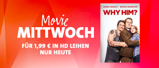Vor einigen Wochen hat Apple den sogenannten "Movie Mittwoch" ins Leben gerufen. Dabei wird jeden Mittwoch ein ausgewählter Film aus dem iTunes-Sortiment für 24 Stunden zum Sonderpreis von nur € 1,99 in HD-Qualität zum Leihen angeboten. Heute erhält man dabei die zum Brüllen lustige Komödie Why Him? mit James Franco. Nachdem man den Leih-Film geladen hat, kann er innerhalb von 30 Tagen angeschauen werden. Wie immer bei geliehenen Filmen aus dem iTunes Store gilt: Hat man hiermit einmal begonnen, muss man ihn innerhalb von 48 Stunden beenden.