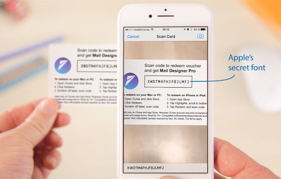 Eine spannende Entdeckung haben die Kollegen von Equinux, die Entwickler hinter der App Mail Designer Pro 3 gemacht und ihn in einem Blogbeitrag geteilt. Dabei geht es um die beliebten iTunes-Guthabenkarten, deren aufgedruckten Code man entweder per Hand eintippen oder aber mithilfe der Kamera im iPhone, iPad oder dem Mac automatisch erkennen und übernehmen lassen kann. Equinux hat dies auf die Idee gebracht, eigene Geschenkkarten für die hauseigenen Apps zu erstellen und ebenfalls über die Kamera einlesbar zu machen. Dies ist offenbar jedoch nicht ohne Weiteres möglich, weswegen die Entwickler etwas genauer nachgeforscht haben. Dabei entdeckten sie, dass Apple für die Umsetzung der Funktion auf der einen Seite eine besondere, versteckte Schriftart und auf der anderen Seite die Größe der Zeichen und ihre Abstände verwendet.