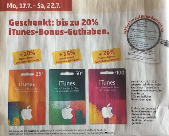 Achtung: Leider kann ich die Hinweise auf die günstigen iTunes-Karten nicht in jedem einzelnen Fall überprüfen. Checkt daher bitte vorher noch einmal ab, ob die jeweilige Filliale den Rabatt auch tatsächlich gewährt!