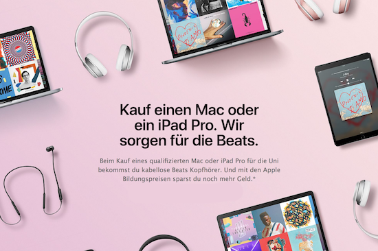 Nachdem die USA bereits vor einigen Tagen in den Genuss der diesjährigen Aktion gekommen sind, hat Apple seine diesjährige "Back to School"-Promotion nun auch in Deutschland gestartet. Die Konditionen sind dabei hierzulande dieselben wie jenseits des großen Teichs. So erhält man beim Kauf eines qualifizierten Mac (iMac, MacBook, MacBook Pro oder MacBook Air) oder iPad Pro über den Education Store ein Paar Beats Solo3, BeatsX oder Powerbeats3 Kopfhörer kostenlos mit dazu. Ausgenommen sind hiervon nach wie vor der Mac mini, der Mac Pro und generalüberholte Geräte. Dasselbe Angebot gilt übrigens auch für Kunden in Österreich und der Schweiz.