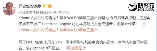 "Die OLED-Erfolgsrate liegt nur bei 60%! Anscheinend ist das Schneiden der speziellen Form das Problem, was zu hohen Produktionskosten führt. Das iPhone 8 wird nicht billig!"