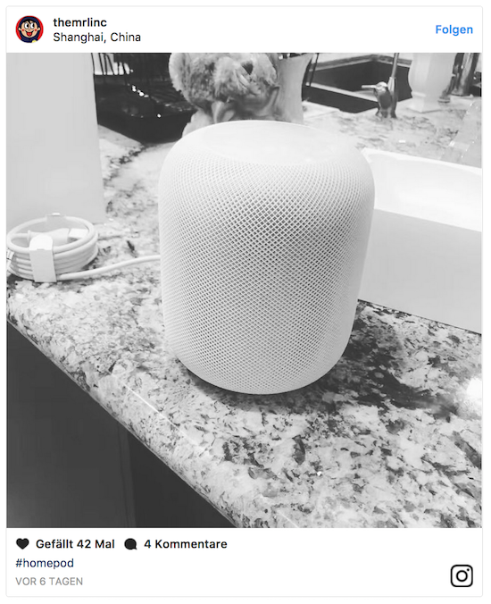 Eigentlich kommt der HomePod erst im September auf den Markt. Und dann auch zunächst nur in den USA, Großbritannien und Australien. Selbstverständlich testen aktuell aber jede Menge Apple-Mitarbeiter bereits den smarten Lautsprecher, was dazu führt, dass er inzwischen auch hin und wieder in freier Wildbahn angetroffen wird. Sicherlich unerfreut dürfte Apple allerdings darüber sein, dass Fotos hiervon inzwischen auch in den sozialen Medien auftauchen. Unter anderem hat ein Nutzer nun ein Foto vom HomePod auf Instagram veröffentlicht, der sich offenbar in dessen Küche befindet. Der Post ist zudem mit dem Standort Shanghai markiert und im Hintergrund sind das Ladegerät und die Verpackung des HomePod zu sehen.