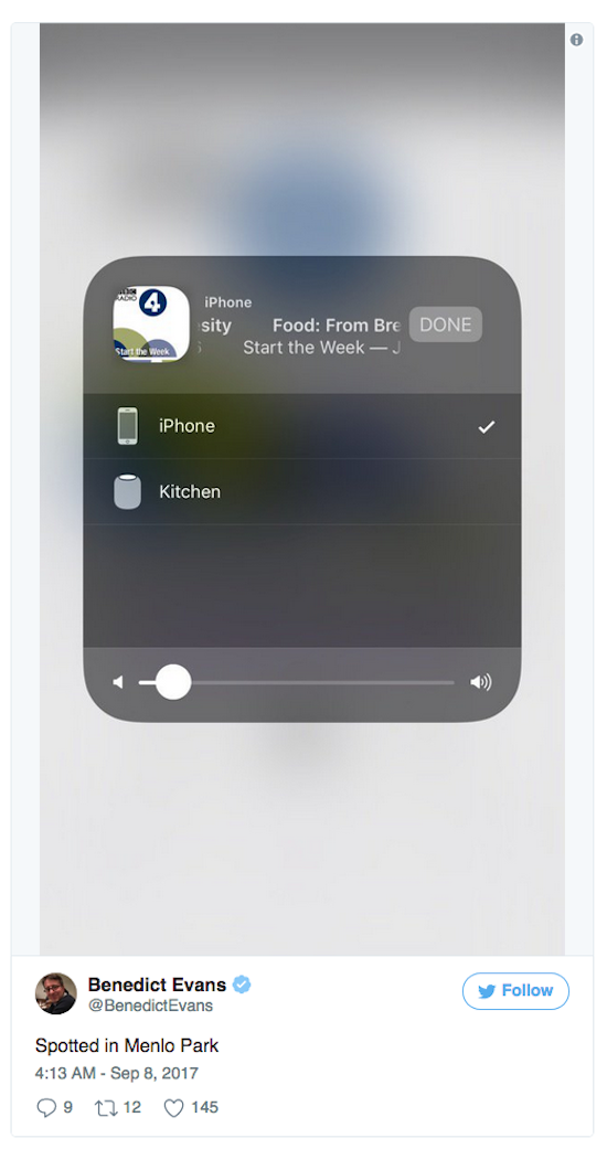 Der Twitter-Nutzer Benedict Evans hingegen veröffentlichte in der vergangenen Nacht einen Screenshot seines Kontrollzentrums, in dem ein HomePod auftauchte während er durch Menlo Park in Kalifornien fuhr. Der gesichtete HomePod trägt dabei die Bezeichnung "Kitchen".