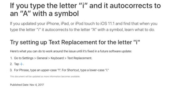 Mit iOS 11.1 hat APple nicht nur eine ganze Reihe von Kinderkrankheiten aus den frühen Versionen von iOS 11 behoben und diverse Sicherheitslücken gestopft. Auch ein neuer Fehler wurde eingeführt, der mir persönlich jedoch noch nicht untergekommen ist. Der Bug steckt in der Autokorrektur von iOS 11.1 und wurde zuerst von dem Reddit-User The Cravin entdeckt. Dabei kann es vorkommen, dass die Eingabe des Buchstabens "i" dazu führt, dass dieser Buchstabe durch eine Kombination aus dem Buchstaben "A", gefolgt von einem Symbol ersetzt wird. Auch wenn der Bug nicht alle Benutzer betrifft, hat Apple nun ein Support-Dokument veröffentlicht, welches sich dieses Themas annimmt. Beschrieben wird darin nicht nur der Fehler selbst, sondern auch gleich noch ein Workaround, wie man ihn umgehen kann, sollte man betroffen sein. Ansonsten muss Apple den Fehler selbst durch ein iOS-Update beheben.
