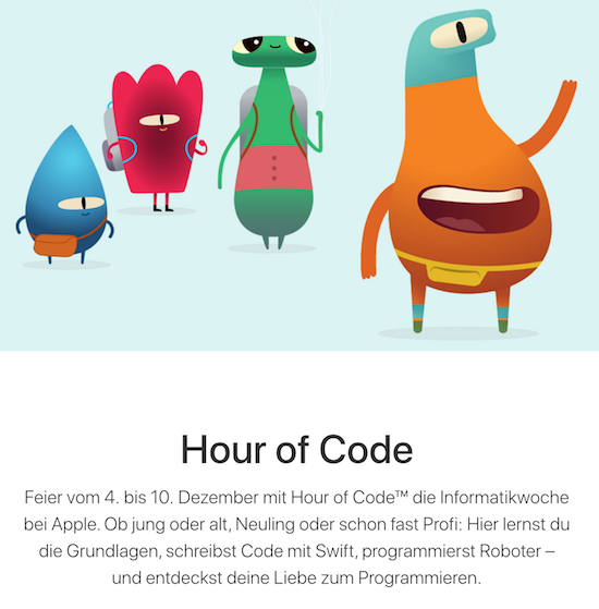 Apple bietet im Dezember in seinen Retail Stores auf der ganzen Welt erneut kostenlose Programmierkurse im Rahmen der "Hour of Code" an. In der Zeit zwischen dem 04. und dem 10. Dezember können dabei Kinder, aber auch Erwachsene jeden Alters an diesen Kursen teilnehmen. Erforderlich ist lediglich eine Anmeldung über die Apple-Webseiten. In Deutschland findet die Hour of Code im Rahmen der Informatikwoche statt. Parallel zu der Ankündigung der kostenlosen Kurse hat Apple auch eine neue spezielle Hour-of-Code-Challenge für seine Swift Playgrounds App für das iPad (kostenlos im AppStore) vorgestellt, bei der ein digitaler Roboter in der App entwickelt und zum Leben erweckt werden soll.