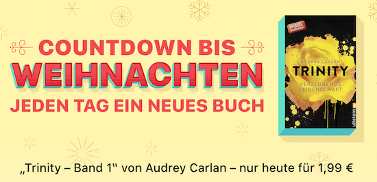 Noch genau eine Woche ist es bis Weihnachten. Und da dies ja bekanntermaßen die Zeit der Geschenke ist, hat Apple nicht nur seine aktuell laufende Aktion "2017 Countdown - 31 Tage, 31 Angebote" am Start, bei der an jedem der 31 Tage des Dezembers jeweils ein Film aus dem iTunes Store zum vergünstigten Sonderpreis angeboten wird, sondern auch eine parallel laufende Aktion für alle Bücherwürmer. Dabei gibt es im "Countdown bis Weihnachten" ebenfalls jeden Tag ein iBook aus dem iBooks Store zum vergünstigten Sonderpreis. Heute lässt sich somit das Leidenschafts-Drama Trinity - Verzehrende Leidenschaft von Audrey Carlan für nur € 1,99 herunterladen.