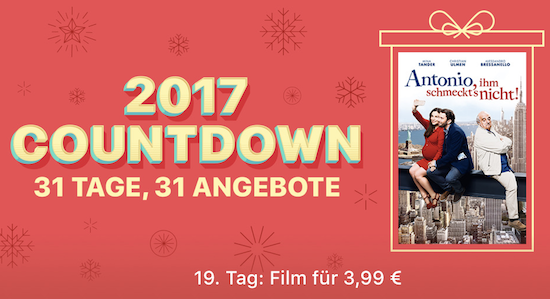 Weihnachten ist die Zeit der Geschenke. Diesem Umstand hat auch Apple in den vergangenen Jahren mit verschiedenen Aktionen im iTunes Store Rechnung getragen. Und so bietet Apple auch in diesem Jahr wieder eine Weihnachtsaktion im iTunes Store an. Dabei erhält man unter dem Motto "2017 Countdown - 31 Tage, 31 Angebote" an jedem der 31 Tage des Dezembers jeweils einen Film aus dem iTunes Store zum vergünstigten Sonderpreis. Heute handelt es sich dabei um die deutsche Komödie Antonio, ihm schmeckt's nicht mit Christian Ulmen, die man für nur € 3,99 in HD-Qualität erwerben kann.