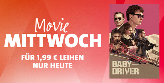 Auch heute hat Apple wieder den sogenannten "Movie Mittwoch" ausgerufen. Dabei wird jeden Mittwoch ein ausgewählter Film aus dem iTunes-Sortiment für 24 Stunden zum Sonderpreis von nur € 1,99 in HD-Qualität zum Leihen angeboten. Heute erhält man dabei den rasanten Action-Blockbuster Baby Driver mit Kevin Spacey und Jamie Foxx. Nachdem man den Leih-Film geladen hat, kann er innerhalb von 30 Tagen angeschauen werden. Wie immer bei geliehenen Filmen aus dem iTunes Store gilt: Hat man hiermit einmal begonnen, muss man ihn innerhalb von 48 Stunden beenden.