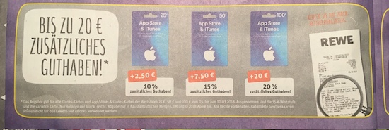 Die neue Woche beginnt mit guten Nachrichten für alle Schnäppchenjäger: Es gibt wieder vergünstigte iTunes-Geschenkkarten. So sind es ab heute die Filialen der Supermarktkette REWE die die Karten mit einem kostenlosen Bonusguthaben in Höhe von bis zu 20% auf den regulären Kartenwert anbieten. Dabei erhält man für die Karten im Wert von € 25,- einen Bonus in Höhe von 10%, bei € 50,- sind es 15% und bei den Karten im Wert von € 100,- sogar 20% des Kartenwerts. Aber Achtung: Die Aktion gilt nur bis Samstag, den 10. März 2018, bzw. solange der Vorrat reicht. Die Anzahl der Karten pro Kauf ist anscheinend nicht begrenzt. Man sollte also im Zweifel schnell sein, um noch rechtzeitig zuschlagen zu können. Schließlich haben die Karten ja kein Verfallsdatum. Der aufgedruckte Wert der Karten und das Zusatz-Guthaben können sowohl für Musik, als auch für Fernsehserien, Filme und Einkäufe im Mac- und iOS-AppStore genutzt werden. (mit Dank an Mathias!)