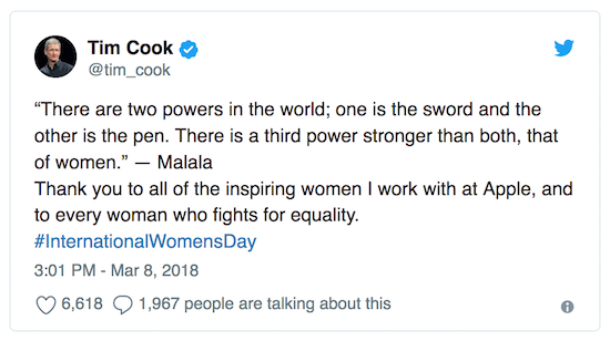 Neben verschiedenen speziellen Sektionen und Playlisten im iTunes Store und bei Apple Music hat sich auch Apple CEO Tim Cook mit einem Tweet zu Wort gemeldet und zitiert dabei die pakistanische Nobelpreisträgerin Malala Yousafzai, mit der man erst kürzlich eine Kooperation zur Schaffung besserer Bildungsmöglichkeiten von Mädchen in Entwicklungsländern eingegangen ist.