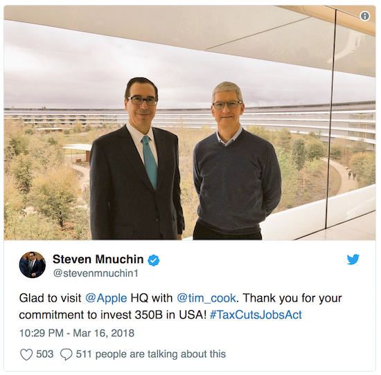 Vor wenigen Tagen weilte Apple CEO Tim Cook am Capitol Hill, also dem Regierungsviertel der US-Hauptstadt Washington D.C., um sich dort mit verschiedenen Senatoren und Abgeordneten zu treffen. Nun erfolgte eine Art Gegenbesuch. Der US-amerikanische Finanzminister Steven Mnuchin besuchte Tim Cook im Apple Park, um ihm unter anderem für das gesteigerte Investment Apples in den USA zu danken. Bereits kurz nach Amtsantritt hatte US-Präsident Donald Trump ja verkündet, dass er US-Unternehmen dazu zwingen werde, mehr in den USA zu produzieren und somit die Wirtschaft zu stärken und Arbeitsplätze zu schaffen.