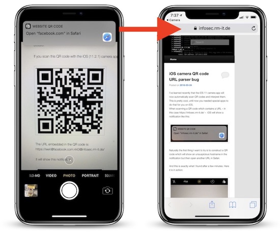 Offenbar wurde eine weitere Sicherheitslücke in iOS 11 entdeckt, bei der dieses Mal der neue QR-Codescanner in der vorinstallierten Kamera-App betroffen ist. Wie Infosec berichtet, ist es Sicherheitsforschern gelungen, dem Scanner einen manipulierten QR-Code unterzujubeln, der dem Benutzer suggeriert, eine vertrauenswürdige Webseite aufzurufen, während eigentlich eine ganz andere Seite, etwa eine gleich aussehende Fishing-Seite geöffnet wird. Demonstriert wird dies anhand eines QR-Codes, der in der erscheinenden Benachrichtigung vorgibt, facebook.com in Safari zu öffnen, beim Tap des Nutzers jedoch eine andere Webseite aufruft.