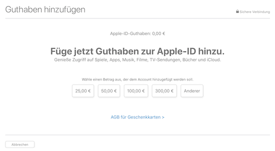 Auch seit heute gibt es wieder vergünstigte iTunes-Guthaben bei Aldi-Süd zu ergattern. Zudem läuft den Rest der Woche auch noch eine Aktion beim MediaMarkt, wie vor einigen Tagen vermeldet. Insofern ist man eigentlich nicht darauf angewiesen, nicht-vergünstigtes Guthaben bei Apple selbst zu beziehen. Sollte dies dennoch einmal notwendig sein, gibt es nun einen einfachen Weg, dies zu bewerkstelligen, wie die Kollegen von MacObserver zuerst herausgefunden haben. So findet man inzwischen in den Account-Einstellungen zur eigenen Apple ID inzwischen einen Menüpunkt namens "Guthaben hinzufügen" über den sich das Guthabenkonto schnell und einfach mit vorgegebenen Beträgen in Höhe von € 25,-, € 50,-, € 100,- oder € 300 aufstocken lässt.