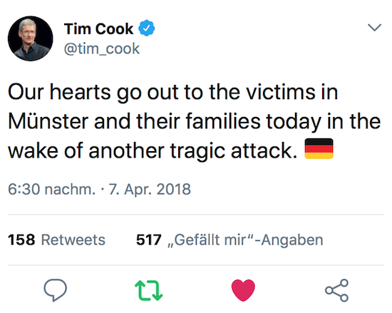 Dass Apple CEO Tim Cook sich zu bestimmten, auch tragischen Anlässen vie Twitter zu Wort meldet, kennt man inzwischen. Meist trifft dies jedoch auf Ereignisse in den USA oder auf Orte zu, an denen sich Cook gerade aufhält. Anlässlich der tragischen Ereignisse am heutigen Nachmittag in Münster ist Cook aber nun auch in Gedanken bei den Opfern des Anschlags und deren Angehörigen. Erneut über Twitter drücke er sein Beileid und sein Mitgefühl aus. Etwas, dem ich mich hiermit ausdrücklich anschließen möchte.