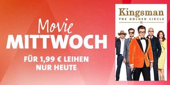 Auch heute hat Apple wieder den sogenannten "Movie Mittwoch" ausgerufen. Dabei wird jeden Mittwoch ein ausgewählter Film aus dem iTunes-Sortiment für 24 Stunden zum Sonderpreis von nur € 1,99 in 4K-HDR--Qualität zum Leihen angeboten. Heute erhält man dabei den äußerst empfehlenswerten Action-Blockbuster Kingsman - The Golden Circle. Nachdem man den Leih-Film geladen hat, kann er innerhalb von 30 Tagen angeschauen werden. Wie immer bei geliehenen Filmen aus dem iTunes Store gilt: Hat man hiermit einmal begonnen, muss man ihn innerhalb von 48 Stunden beenden.