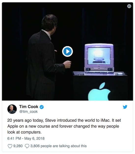 Heute vor exakt 20 Jahren spielte sich aus Apple-Sicht schon beinahe etwas Historisches ab. Der 06. Mai 1998 markiert nämlich den Tag, an dem Steve Jobs acht Monate nach seiner Rückkehr zu dem Unternehmen, welches er eins mitgegründet hatte, den iMac präsentierte. Und auch wenn Apple normalerweise nicht unbedingt für Sentimentalität bekannt ist, hat sich der aktuelle Apple CEO Tim Cook hierzu heute via Twitter zu Wort gemeldet.