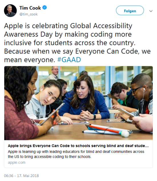 In diesem Zusammenhang hat Apple außerdem bekanntgegeben, dass das äußerst beliebte Everyone Can Code ab dem Herbst auch für taube, blinde oder anderweitig sehbehinderte Menschen in den USA zur Verfügung stehen wird. Hierbei kooperiert man mit verschiedenen Bildungseinrichtungen im ganzen Land. Apple CEO hat dies bei Twitter dann auch passend mit den Worten kommentiert "when we say Everyone Can Code, we mean everyone".
