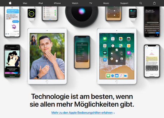 Das Thema Bedienungshilfen, im Englischen Accessibility, liegt Apple schon seit jeher am Herzen. Vor dem Hintergrund des Global Accessibility Awareness Day, der an jedem dritten Donnerstag des Mai abgehalten wird, hat man das Thema nun auch auf seiner Webseite prominent in den Fokus gerückt. Wer aktuell Apples Homepages auf der ganzen Welt besucht, wird von einer extra geschalteten Startseite begrüßt, die auf das Thema hinweist und auch gleich noch einen Link zu den Bedienungshilfen in Apple-Produkten enthält, mit denen die Bedienung vor allem Menschen mit Behinderungen oder Einschränkungen leichter gemacht wird.
