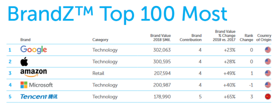 Das Beratungsunternehmen BrandZ hat eine neue Rangliste [PDF] über die wertvollsten Unternehmen der Welt veröffentlicht. Darin findet sich Apple auf dem zweiten Platz wieder und muss sich knapp dem Konkurrenten Google geschlagen geben. Hinter Apple komplettieren Amazon, Microsoft und Tencent die Top 5. Ermittelt wurde das Ranking auf Basis einer Kombination aus Finanzkraft und Kundenmeinung. Dabei greift man auf Daten von Kantar Millward Brown und Bloomberg zurück und berechnet hieraus den Wert des Unternehmens. Google kommt dabei auf 302,06 Milliarden US-Dollar (plus 23%) während man für Apple 300,59 Milliarden Dollar (plus 28%) ermittelt hat. Den größten Sprung in den Top 5 macht der chinesische Technologie-Konzern Tencent mit einem Wahcstum von 65% im Jahresvergleich. Der komplette Bericht kann bei BrandZ eingesehen werden.