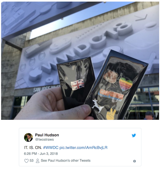 Apples Keynote zur Eröffnung der WWDC beginnt morgen Abend um 19:00 Uhr deutscher Zeit. Bereits jetzt sind aber natürlich diverse Entwickler vor Ort, die das Glück hatten, in Apples Lotterie ausgewählt geworden zu sein, eine Eintrittskarte erwerben zu dürfen. Bei ihrer Registrierung für die Konferenz erhielten sie auch in diesem Jahr wieder eine Tasche mit Begrüßungsgeschenken von Apple, deren Inhalt inzwischen auf sozialen Medien hinreichend dokumentiert wurde. Wie auch schon im vergangenen Jahr findet man in der Tasche eine schwarze Levi's Jeansjacke und verschiedene Ansteck-Pins mit Bezug zu Apple und der WWDC.