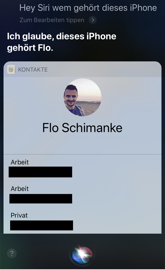 Wer sich übrigens die Frage stellt, wie Dallas die Besitzerin ausfindig machen konnte, ohne den PIN oder Face ID zu umgehen, findet hier die passende Antwort. Dallas selbst hat zu Protokoll gegeben, dass er die SIM-Karte aus dem Telefon genommen und in eines seiner Geräte gesteckt hat, wodurch er auf die Nummer der Besitzerin gestoßen ist. Auch ein anderer Weg funktioniert übrigens. Habt ihr in den Kontakte-Einstellungen eures iPhone eure eigenen Daten hinterlegt und sprecht im Sperrzustand den Befehl "Hey Siri, wem gehört dieses iPhone", wird der folgende Screen angezeigt.