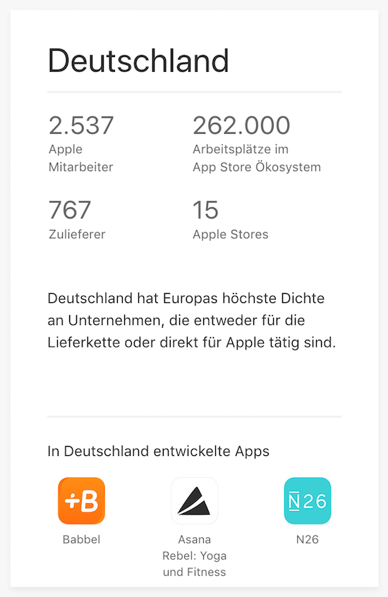 In Sachen Apple-Zulieferer ist Deutschland sogar euopaweit Spitze und besitzt laut Apple die höchste Dichte an Unternehmen (insgesamt 767), die entweder für die Lieferkette oder direkt für das Unternehmen aus Cupertino tätig sind. Durchaus interessante Informationen, für sie sich ein Abstecher auf die erwähnte Sonderseite auf jeden Fall lohnt.