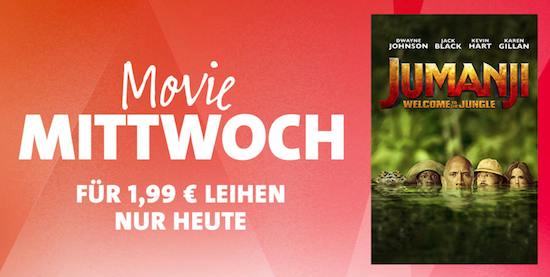Auch heute hat Apple wieder den sogenannten "Movie Mittwoch" ausgerufen. Dabei wird jeden Mittwoch ein ausgewählter Film aus dem iTunes-Sortiment für 24 Stunden zum Sonderpreis von nur € 1,99 in HD-Qualität zum Leihen angeboten. Heute erhält man dabei die Neuauflage des Abenteuerfilms Jumanji mit Dwayne "The Rock" Johnson. Nachdem man den Leih-Film geladen hat, kann er innerhalb von 30 Tagen angeschauen werden. Wie immer bei geliehenen Filmen aus dem iTunes Store gilt: Hat man hiermit einmal begonnen, muss man ihn innerhalb von 48 Stunden beenden.
