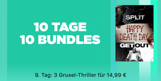Auch heute läuft wieder Apples Aktion "10 Tage, 10 Bundles", bei der sich an 10 Tagen im Juli jeweils ein ausgewähltes Film-Bundle vergünstigt aus dem iTunes Sore laden lassen wird. Dabei lässt sich heute "Drei Grusel-Thriller", bestehend aus den Filme "Split", "Get Out" und "Happy Deathday" in 4K-HDR-Qualität vergünstigt erwerben. Würde man sich die Filme einzeln im iTunes Store kaufen, müsste man insgesamt € 33,97 hinblättern. Dank der Aktion bekommt man nun alle drei im Bundle für zusammen nur € 14,99. Wie immer gilt bei Kauf-Filmen aus dem iTunes Store, dass diese so oft geschaut werden können, wie man mag und dass man sie jederzeit erneut aus dem iTunes Store herunterladen kann. Hier gehts zum heute vergünstigten Bundle: Drei Grusel-Thriller