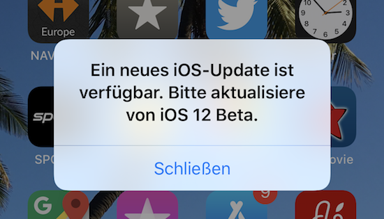 Nach verschiedenen Meldungen von Beta-Testern, dass die Vorabversion vom vergangenen Montag die Nutzer mit ständig erscheinenden Update-Hinweisen nerve (siehe unten), hat Apple am heutigen Nachmittag die inzwischen zwölfte Betaversion von iOS 12 für registrierte Entwickler veröffentlicht, die dieses Problem behebt. Die Veröffentlichung der finalen Version dürfte dann kurz nach dem inzwischen angekündigten iPhone-Event am 12. September erfolgen gerechnet. Parallel zur zwölften Beta für Entwickler steht übrigens auch die zehnte Public Beta von iOS 12 zum Download bereit. Beide Versionen sind identisch.