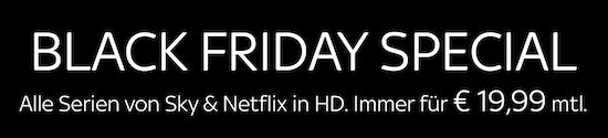 Nicht nur Online-Händler wie Amazon bieten anlässlich des am kommenden Freitag anstehenden Black Friday jede Menge Rabatte auf die verschiedensten Produkte an, auch der Pay-TV Sender Sky ist aktuell mit einem Black Friday Deal vertreten. Und dabei können Serienfans richtig sparen. So kann man aktuell mit Sky Q alle Serien von Sky sowie alle Inhalte von Netflix aus einer Hand deutlich vergünstigt abonnieren. Das laut Sky "beste Serienangebot aller Zeiten" kostet dabei dauerhaft monatlich nur € 19,99 statt normalerweise € 32,99. Sämtliche Inhalte werden in brillantem HD angeboten und der Sky Q Receiver ist dabei immer inklusive. Der folgende Link führt direkt zum Angebot: Black Friday Special bei Sky