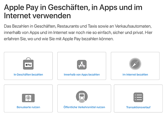 Die Einschläge in Sachen Apple Pay Start in Deutschland kommen weiter näher. Nachdem erst kürzlich ein internes Memo für ALDI-Mitarbeiter in Belgien einen Start des Dienstes noch in der laufenden Woche andeutete, legt nun Apple selbst noch einmal nach und hat ein neues deutschsprachiges Support-Dokument mit dem Titel "Apple Pay in Geschäften, in Apps und im Internet verwenden" veröffentlicht (mit Dank an Stefan!). Ganz der Überschrift folgend wird darin die Nutzung von Apple Pay noch einmal in allen Einzelheiten und mit all ihren Besonderheiten beschrieben. Die Veröffentlichung am gestrigen Tage kann dabei durchaus als Wink mit dem Zaubpfahl gewertet werden.