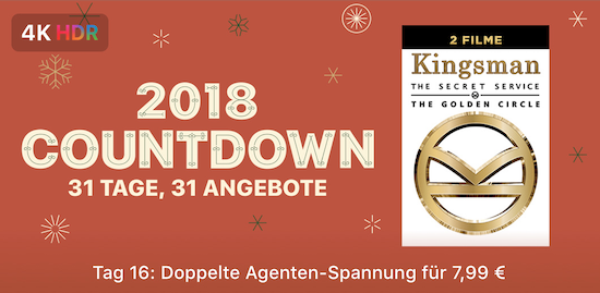 Das Weihnachtsfest rückt mal wieder näher und während sich bei manchen Freude und Besinnlichkeit breit macht, kommt bei anderen eher Hektik beim Weihnachtsshopping in den sich füllenden Fußgängerzonen und Shoppingzentren dieser Welt auf. Vor allem für Kinder bedeutet die Zeit bis zum Weihnachtsfest jeden Tag ein bisschen Freude beim Öffnen der Türen des Adventskalenders. Auch Apple bietet in diesem Jahr wieder eine Dezember-Aktion an und weitet diese gar auf 31 Tage, also bis zum Ende des Monats aus. Unter dem Motto "2018 Countdown - 31 Tage, 31 Angebote" wird man dabei jeden Tag einen neuen Inhalt aus dem Film-Bereich des iTunes Store zum Sonderpreis laden können. Heute erhält man auf diese Weise das Kingsman-Bundle, bestehend aus den beiden Teilen der Agenten-Action für nur € 7,99 in 4K HDR-Qualität zu Kaufen.