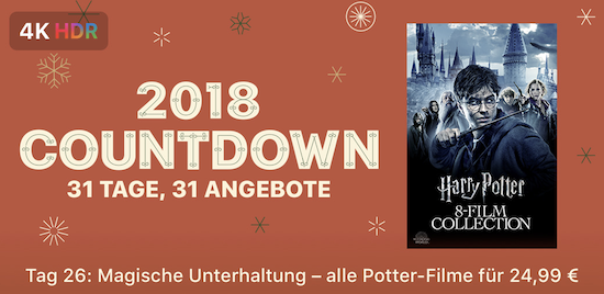 Das Ende des laufenden Jahres rückt mal wieder näher und vor allem für Kinder bedeutet die Zeit rund um das Weihnachtsfest jeden Tag ein bisschen Freude beim Öffnen der Türen des Adventskalenders. Auch Apple bietet in diesem Jahr wieder eine Dezember-Aktion an und weitet diese gar auf 31 Tage, also bis zum Ende des Monats aus. Unter dem Motto "2018 Countdown - 31 Tage, 31 Angebote" wird man dabei jeden Tag einen neuen Inhalt aus dem Film-Bereich des iTunes Store zum Sonderpreis laden können. Heute erhält man auf diese Weise die Harry Potter Complete Collection für nur € 24,99 in 4K HDR-Qualität zu Kaufen.