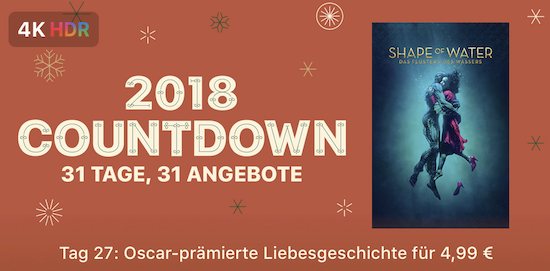 Das Ende des laufenden Jahres rückt mal wieder näher und vor allem für Kinder bedeutet die Zeit rund um das Weihnachtsfest jeden Tag ein bisschen Freude beim Öffnen der Türen des Adventskalenders. Auch Apple bietet in diesem Jahr wieder eine Dezember-Aktion an und weitet diese gar auf 31 Tage, also bis zum Ende des Monats aus. Unter dem Motto "2018 Countdown - 31 Tage, 31 Angebote" wird man dabei jeden Tag einen neuen Inhalt aus dem Film-Bereich des iTunes Store zum Sonderpreis laden können. Heute erhält man auf diese Weise die Oscar-prämierte Liebesgeschichte Shape of Water für nur € 4,99 in 4K HDR-Qualität zu Kaufen.