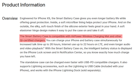 "The Smart Battery Case is compatible with AirPower Wireless Charging Mat and other Qi?certified chargers."