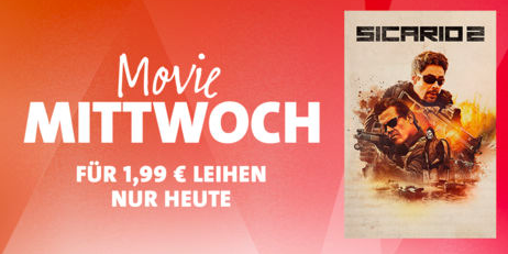Auch heute hat Apple wieder den sogenannten "Movie Mittwoch" ausgerufen. Dabei wird jeden Mittwoch ein ausgewählter Film aus dem iTunes-Sortiment für 24 Stunden zum Sonderpreis von nur € 1,99 in HD-Qualität zum Leihen angeboten. Heute erhält man dabei den Action-Thriller Sicario 2 mit Benicio Del Toro. Nachdem man den Leih-Film geladen hat, kann er innerhalb von 30 Tagen angeschauen werden. Wie immer bei geliehenen Filmen aus dem iTunes Store gilt: Hat man hiermit einmal begonnen, muss man ihn innerhalb von 48 Stunden beenden.