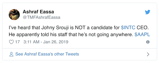 Vor einigen Tagen kamen Meldungen auf, dass Apples Chip-Guru Johny Srouji einer der Kandidaten für den Posten als CEO beim weltgrößten Chip-Hersteller Intel sei. Ein Verlust von Srouji wäre für Apple ein herber Schlag, erst recht vor dem Hintergrund der Bestrebungen, künftig immer mehr der in den eigenen Produkten verbauten Chips selbst zu designen. Doch offenbar muss man sich in Cupertino keine Sorgen machen. Wie Ashraf Eassa von The Motley Fool auf Twitter berichtet, soll Der Chip-Experte sein Team informiert haben, dass er bei Apple bleiben werde. Essa ist vor allem bei Intel sehr gut vernetzt und verfügt über jede Menge Insider-Informationen beim Chip-Hersteller.