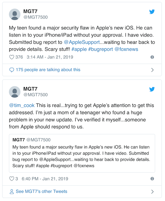 Doch der Reihe nach. Wie die Kollegen von MacRumors berichten, hat die Twitter-Nutzerin MGT7500 den Apple Support in einem Tweet am 20. Januar verlinkt, in dem sie berichtete, dass ihr 14-jähriger Sohn ein Problem mit FaceTime-Gruppenanrufen entdeckt habe - nämlich genau das Problem, welches in der vergangenen Nacht öffentlich bekannt wurde. In einem weiteren Tweet vom 21. Januar wurde dann neben dem Apple Support auch noch CEO Tim Cook verlinkt.