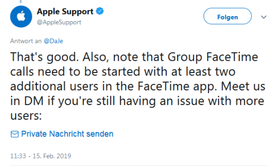 Mit dem Update auf iOS 12.1.4 wollte Apple eigentlich die schwere Sicherheitslücke in Gruppengesprächen über FaceTime behoben und die vorübergehend deaktivierte Funktion wieder aktiviert haben. Wie es aussieht, ist dies jedoch offenbar nicht komplett der Fall. So existiert inzwische ein längerer Foren-Thread bei den Kollegen von MacRumors, in dem Nutzer darüber berichten, dass sie derzeit keine neuen Benutzer zu einem 1-zu-1 Gespräch hinzufügen können. Der entsprechende Button bleibt in diesem Falle schlicht funktionslos. Die derzeit einzige Möglichkeit, Gruppengespräche zu führen und nach und nach weitere Nutzer hinzuzufügen ist, indem man ein Gruppengespräch mit mindestens drei Personen beginnt. Dies scheint Apple auch bereits bewusst zu sein, wenn man den folgenden Tweet mal als Beispiel nimmt.