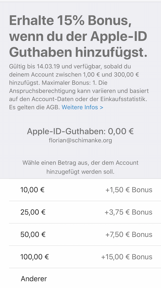 Um das Extra-Guthaben zu erhalten, begibt man sich auf seinem iPhone oder iPad in die Einstellungen und dort in den Bereich "iTunes & App Stores". Hier tippt man auf ganz oben auf seine Apple-ID, dann auf "Apple-ID anzeigen" und anschließend auf "Guthaben zur Apple-ID hinzufügen". Hier wird einem die Option automatisch und wie unten zu sehen angeboten.