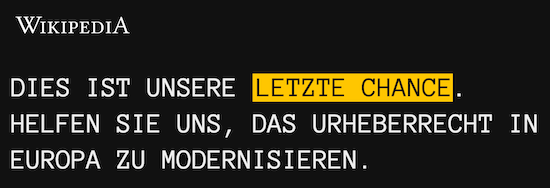 Selbstverständlich bin auch ich der Meinung, dass das Urheberrecht geschützt sein muss. Allerdings ist das Gesetz in der aktuell ausgearbeiteten Form von jedem, der das Internet gerne nutzt und der damit arbeitet so nicht hinnehmbar. Aus diesem Grunde unterstütze ich die Kollegen von Wikipedia ausdrücklich in ihrer Protestaktion und schließe micht dem Aufruf an, sich an einer Online-Petition gegen die Verabschiedung des Gesetzes zu beteiligen und diese Meinung auch gegenüber euren jeweiligen Europa-Abgeordneten kund zu tun.