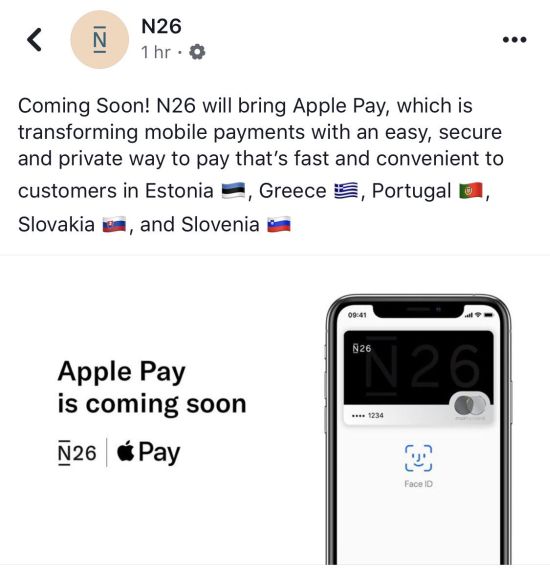 Nicht nur unsere Nachbarn in Österreich dürfen sich demnächst über die Ankunft von Apple Pay in ihrem Land freuen, auch in Estland, Griechenland, Portugal, Rumänien, der Slovakei und Slowenien soll es in Kürze soweit sein. Dies bestätigen inzwischen verschiedene Banken, mit denen Apple direkt zum Start zusammenarbeitet. Während für Rumänien die ING Bank den baldigen Start auf ihrem Twitter-Account ankündigte, übernahm dies für die restlichen genannten Länder N26 via Facebook. Vermutlich auf Betreiben Apples wurde der Post zwar inzwischen wieder gelöscht, allerdings haben natürlich verschiedene Nutzer bereits Screenshots angefertigt und diese veröffentlicht. Zudem hat N26 auf Anfrage eines Nutzers erneut den baldigen Start in Portugal via Twitter bestätigt. Für die Slowakei hat zudem auch die örtliche Sparkasse den Start für später im Jahr bestätigt. (via Aktuality.sk)