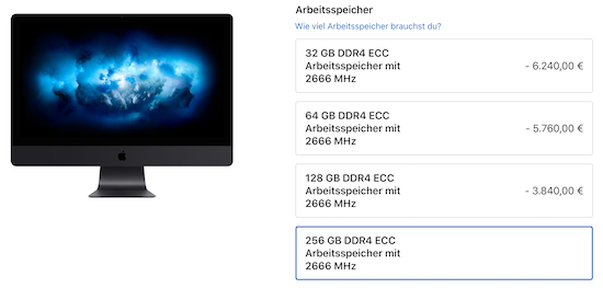 Gemeinsam mit der neuen Vorstellung der neuen iMacs in der vergangenen Woche auch eine neue Option eingeführt, den iMac Pro nun auch mit 256 GB Arbeitsspeicher zu bestücken. Wie sich inzwischen herausgestellt hat, lässt sich ein Upgrade auf diesen Wert jedoch nicht bei einem älteren Modell durchführen durchführen. Dies liegt daran, dass ausschließlich der mit 256 GB RAM direkt bei Apple bestellte iMac Pro in der Lage ist, vier 64 GB Speichermodule aufzunehmen. Dies hat Apple in einem internen Dokument gegenüber seinen Apple Stores und seinen authorisierten Service Partnern bekanntgegeben. Einen Grund liefert Apple zwar nicht, es ist jedoch möglich, dass hier bei einer entsprechenden Bestellung eine spezielle Variante des Motherboards verbaut wird. Damit ist die Bestellung des iMac Pro von vornherein mit 256 GB RAM die derzeit einzige Möglichkeit, diese Menge an Arbeitsspeicher im iMac Pro zu erhalten. Und dies lässt sich Apple auch fürstlich entlohnen: Die maximale Menge an RAM kostet als Upgrade im Apple Store satte € 6.240,-, die mindestens noch auf die Standardkonfiguration für € 5.499,- aufgeschlagen werden. (via MacRumors)